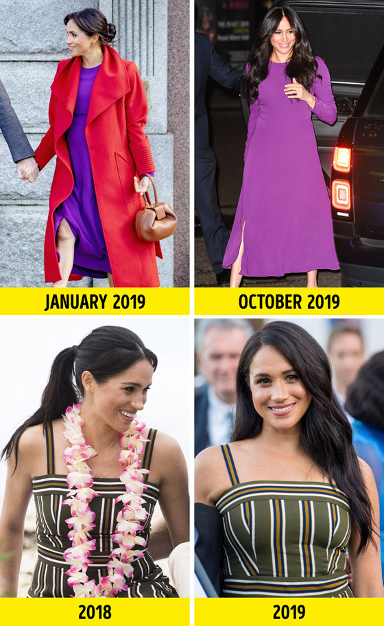 7. ميجان ماركل: تحاول دوقة ساسكس ميجان ماركل، مواكبة ارتداء الملابس نفسها عدة مرات، ظهرت مؤخرًا وهي ترتدي نفس الأزياء مرة أخرى.
