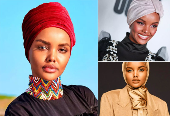 5. حلمية عدن: أول عارضة أزياء عالمية محجبة: تعتبر عارضة الأزياء الصومالية حليمة عدن، أول عارضة مسلمة محجبة، تظهر كوجهٍ دعائي لعدد من العلامات التجارية الشهيرة. وقد ظهرت وهي ترتدي الملابس الرياضية لواحدة من العلامات الكبرى. كما ظهرت في مجلة Sports Illustrated وهي ترتدي البوركيني والحجاب. وقالت عدن في حوارٍ تلفزيوني في وقت سابق، إنها تود أن توجه بعملها في مجال عرض الأزياء، فكرةً مفادها أن الحجاب لا يشكل أي عائق في طريق النجاح. ولدت حليمة عدن في كينيا في مخيم كاكوما للاجئين، وقضت فيه سنوات طفولتها ثم انتقلت مع عائلتها إلى الولايات المتحدة الأميركية.