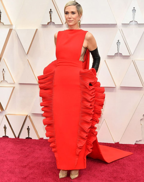 20- كريستين ويغ: اختارت فستانا غريبا جدا باللون الاحمر، غير عملي وغير مريح ويبدو انه من الصعب جدا لبسه والمشي او الجلوس به.