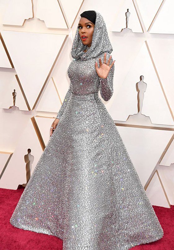 1- جانيل مونيه: ظهرت النجمة العالمية جانيل مونيه بإطلالة ساحرة محتشمة ولمسة من الأناقة والرقي، واختارت فستان فضي براق مع غطاء أنيق للرأس من تصميم دار أزياء رالف لورين Ralph Lauren .