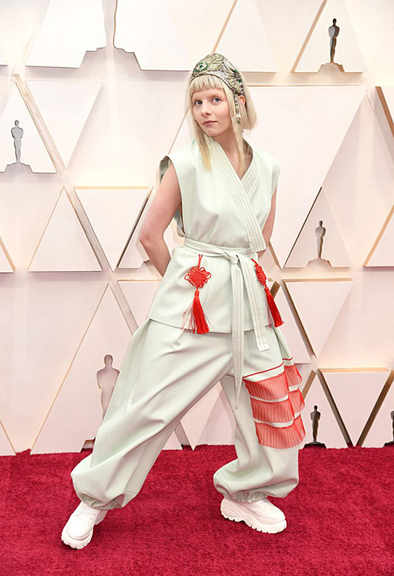 18- اورورا: صدمت المغنية وكاتبة الأغاني النرويجية اورورا الجميع بإطلالتها غير الموفقة حيث ارتدت بدلة باللون الأخضر الفاتح مزينة بأشرطة حمراء وتاج بلون ذهبي ومجوهرات خضراء. كانت اطلالة سيئة جدا لا تناسب السجادة الحمراء..