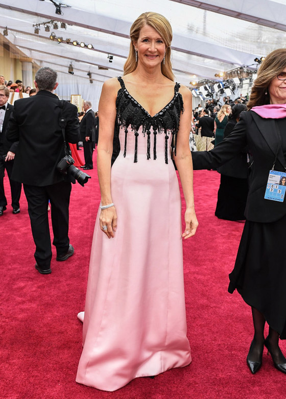 4- لورا ديرن: سارت هذه النجمة الانيقة على السجادة الحمراء بفستان من تصميم أرماني Armani بلون وردي فاتح مع تطريز كريستال باللون الأسود، ورافقتها على السجادة الحمراء والدتها الممثلة ديان لاد، التي ارتدت بدلة من المخمل وبلوزة منقوشة.من تصميم جورجيو أرماني.