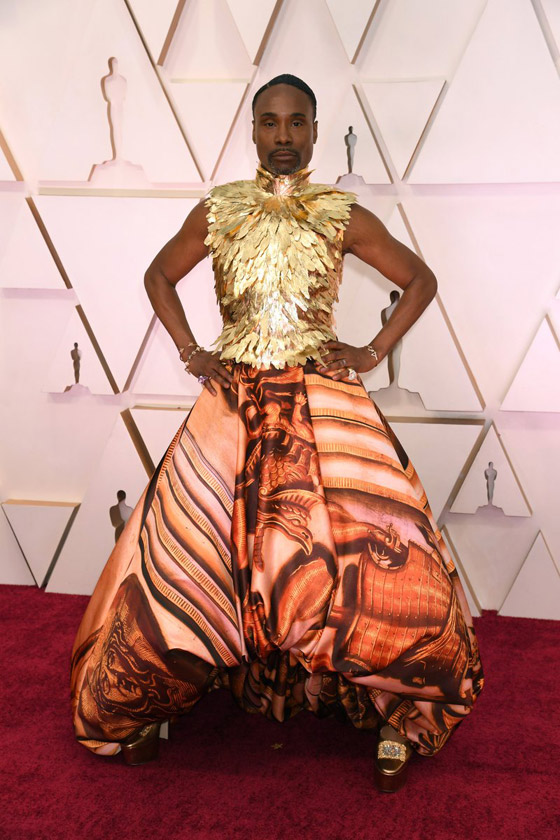 5- بيلي بورتر: أثارت اطلالة الممثل والمغنى الأمريكي بيلي بورتر الكثير من الاستغراب والجدل، وكانت كما قرانا في موقع شايف الصحافة العالمية وآراء خبراء الموضة، من أسوأ الاطلالات.. فقد ارتدى بلوزة ضيقة بدون اكمام يزينها الريش بلون ذهبي، مع تنورة منفوشة "جيب" بذيل طويل، مزينة بالنقوش والرسوم الكثيرة بدرجات البرتقالي والبيج.