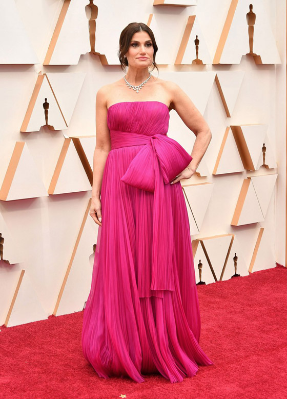 6- أيدينا مينزيل: ظهرت بطلة فيلم "فروزن" أيدينا مينزل، على السجادة الحمراء ،وهي ترتدي فستانًا أنيقًا بلون الفوشيا (زهري غامق) مصنوع ىمن قماش فاخر، يزينه حزام على الخصر وعقدة فيونكة كبيرة بنفس لون الفستان. اثار الفستان اعجاب الكثيرين مع ملاحظه صغيرة انه كان سيبدو اجما واكثر الكنمالا لو كان ذيل الفستان أقصر قليلا ولا يجر على الأرض.