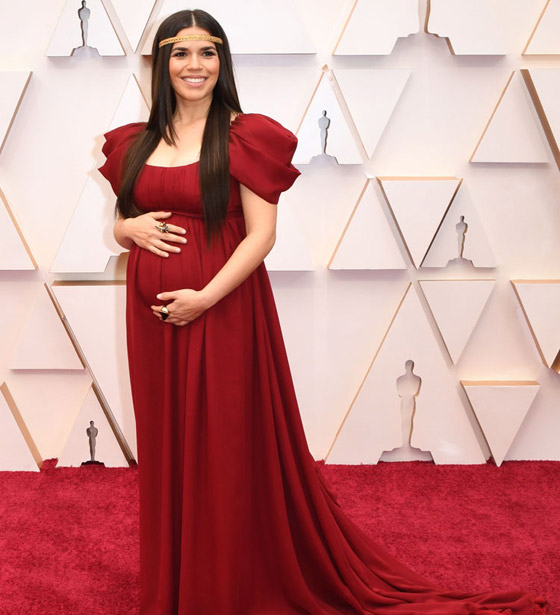 8- أميركا فيرارا: تألقت الممثلة الامريكية الحامل أميركا فيرارا في حفل الأوسكار وارتدت فستاناً أحمر بطابع قبائل هندوراس من وحي دورها في احد الأفلام التي مثلت فيها شخصية الملكة أستريد وزينت شعرها بطوق ذهبي. الفستان من تصميم البيرتا فيريتي.