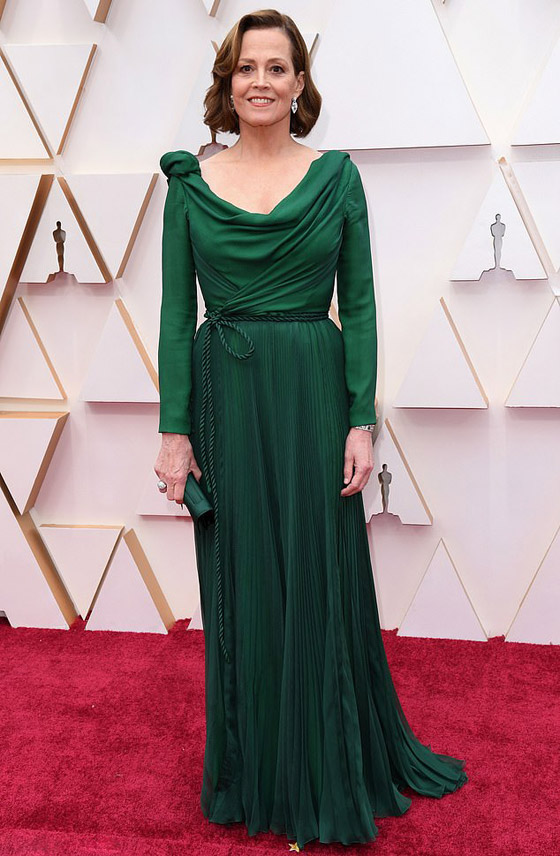 9- سيجورني ويفر: رغم بلوغها الـ 70 عاما، تحافظ النجمة العالمية سيجورني ويفر على اطلالة انيقة ناعمة. واختارت للسجادة الحمراء فستانا باللون الأخضر بتصميم ناعم ومحتشم، تميز بشكل خاص بالتصميم المتهدل الناعم في اعلى الفستان عند فنحة الرقبة والزينة على كتف واحد. الفستان من تصميم دار أزياء كريستيان دور، وأكملت اطلالتها بحقيبة يد وحذاء من تصميم نفس الدار.