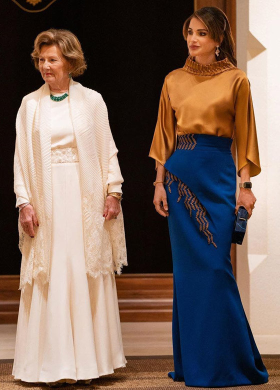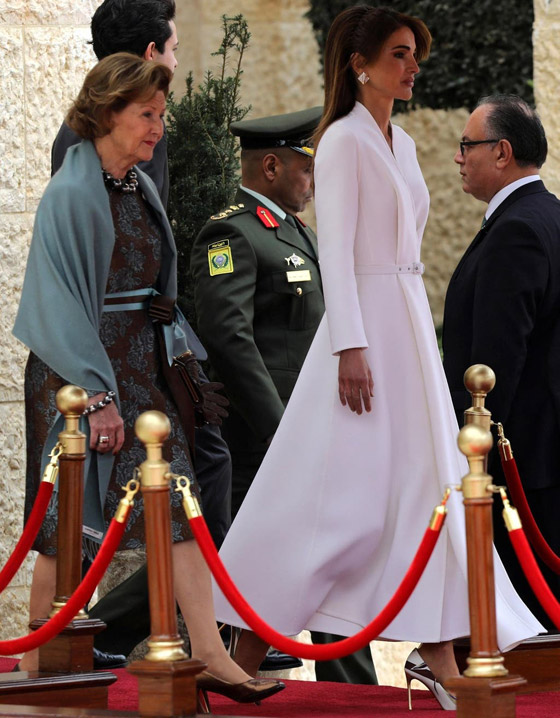 وكانت الملكة رانيا استقبلت في صباح اليوم نفسه نظيرتها النرويجية الملكة صونيا لدى وصولها إلى الأردن في زيارة رسميّة برفقة زوجها ملك النرويج هارالد الخامس. وقد ظهرت في حفل الاستقبال بثوب أبيض طويل تزيّن بحزام حدّد الخصر ونسّقته مع حقيبة جلدية باللون العسلي وحذاء باللون الأبيض، فيما اختارت ملكة النرويج ثوباً مطبّعاً باللونين البني والرمادي.