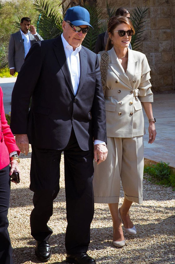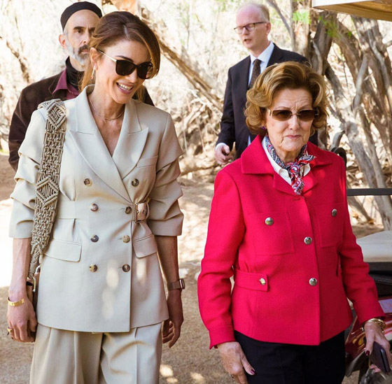 أما في اليوم التالي فرافقت ملكة الأردن ضيوفها إلى موقع مغطس السيد المسيح في الأردن، حيث ظهرت ببدلة "ساهاريان" تميّزت بسترة ذات كمّين مبتكرين وحزام يحدّد الخصر من الخلف. وقد نسّقتها مع سروال عريض ومتوسّط الطول باللون نفسه، فيما اعتمدت ملكة النرويج للمناسبة سترة باللون الأحمر ارتدتها مع سروال أسود، قميص أبيض، ووشاح حريري مطبّع حول العنق.