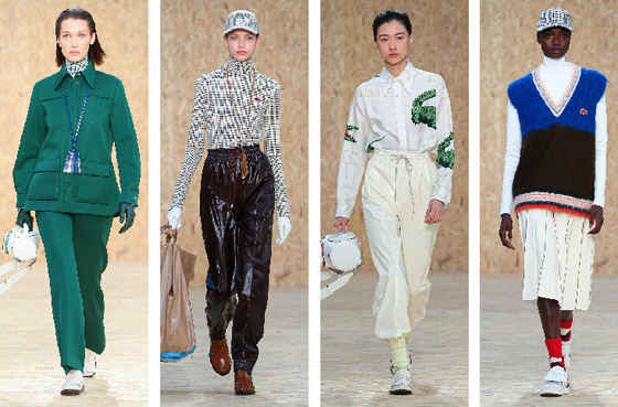 توجهنا بعد ذلك إلى مقر عرض دار لاكوست Lacoste في تمام الساعة الـ4:30، وقد شاهدنا بالفعل مجموعة مميزة افتتحتها بيلا حديد Bella Hadid ، في تصميم ذي طابع رياضي باللون الأخضر، ومن ثم توالت التصاميم التي بدت حيوية وشبابية؛ امتزجت فيها الألوان بشكل لافت مثل الأخضر مع الزهري والأزرق مع البني والأحمر مع الأخضر والبرتقالي مع النيلي. شاهدنا التصاميم ذات الطابع الرياضي، وأيضاً الأزياء السبور شيك، وقد لفتتنا المعاطف الأنيقة والتنانير البليسيه المميزة.
