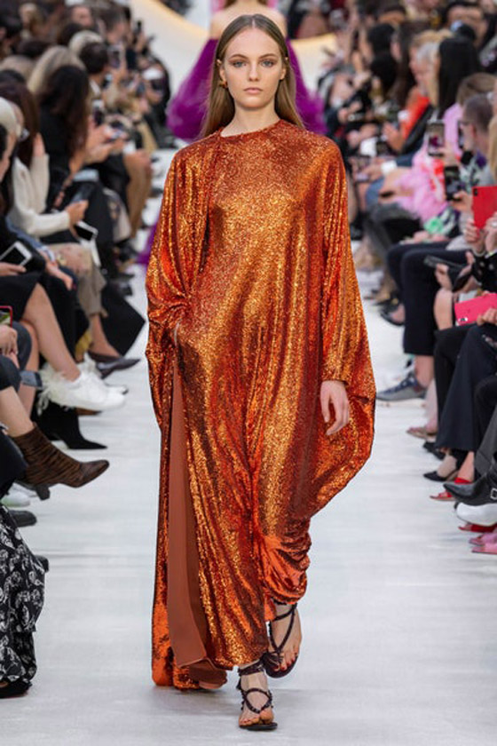أضفي الرونق على إطلالتك المسائية في رمضان 2020 من خلال القفاطين اللماعة سواء كانت بالزخرفات أو بالترتر البراق. وقد لفتنا القفطان بتصميمه الواسع من الترتر البرتقالي على منصة عرض فالنتينو Valentino.نسقيه مع إكسسوارات بسيطة باللون الأسود لتفادي الإطلالة المبالغ فيها.