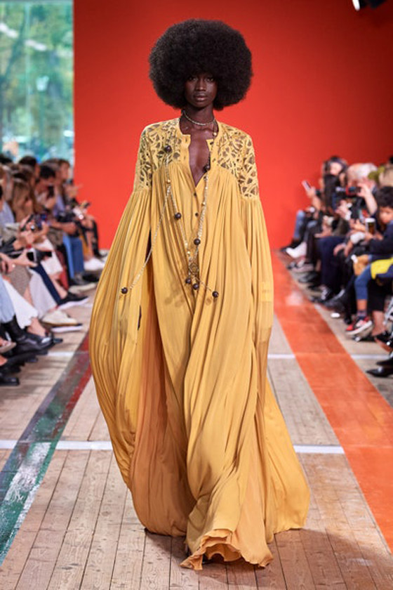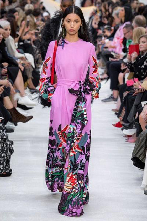 لم تغب القفاطين الملونة عن مجموعة ألبيرتا فيريتي Alberta Ferretti لموسم ربيع 2020، حيث نثرت سحر ألوانها الحيوية والمشرقة مثل الفوشيا والبنفسجي ومزيج الألوان على منصة العرض. وقد ظهرت بتصاميم متنوعة تراوحت بين الأكمام المنفوخة balloon sleeves والزخرفات والتطريزات. وكذلك أعجبنا القفطان باللون البنفسجي بطبعات الورود العريضة على منصة عرض فالنتينو Valentino، والذي يمكنك ارتداؤه كفستان محتشم.