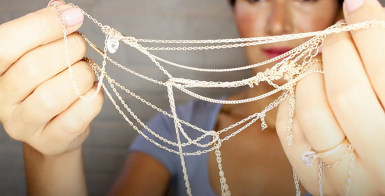إذا كنت تحبين ارتداء طبقات من القلائد والسلاسل ذات الأحجام والأطوال المختلفة، قد ينتهي بها متشابكة مع بعضها البعض في مرحلة ما، الأمر يحدث أيضا عند تخزينها بطريقة عشوائية، وكثيرا ما نجد أن فك تشابك السلاسل أمر صعب بشكل لا يصدق، فكلما كانت السلسلة طويلة ورفيعة كلما كانت مهمة فكها أصعب.