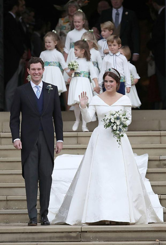 عندما تزوجت الأميرة أوجيني جاك بروكس بانك في عام 2018، ارتدت تصميم فستان بلغ سعره 200.000 جنيه استرليني، أي ما يزيد عن 4 ملايين جنيه مصري. صمم الفستان بواسطة المصمم البريطاني بيتر بيلوتو وكريستوفر دي فوس. عملت أوجيني عن كثب مع الثنائي لإنشاء عدد من الزخارف ذات المغزى بما في ذلك زهرة Thistle من سكوتلاند كإيماءة لتراث العروس ويورك روز واللبلاب الذي يمثل منزل الزوجين. كما اختارت شكلاً يُظهر ندبة أصيبت بها من جراحة الجنف على ظهرها.