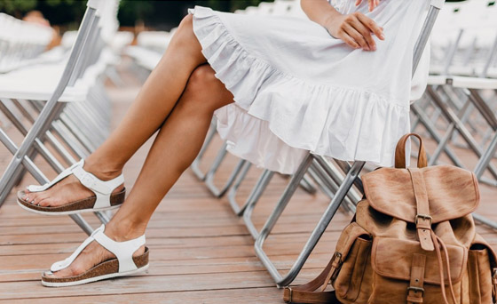 3. الصندل: هذا النوع يوفر الدعم للقدمين ويسمح لهما بالتنفس، ورغم هذا لا يُعد مناسبا للمشي لمسافات طويلة، وعلاوة على ذلك فهو يُصنع من مواد اصطناعية تتسبب في تعرق القدمين. لذا عند اختيار الصنادل عليك اختيار ما له نعل سميك وُمدعّم؛ إذ إن النعل المسطح والرقيق يتسبب في تعب القدمين. كما أن عليك اختيار الصندل المصنوع من مواد طبيعية ليمنع التعرق، وإن رغبتِ في صندل بكعب، فحاولي اختيار كعب لا يرتفع أكثر من 5 سم وليكن الكعب سميكا.