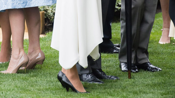 جوارب ذات وسادة سيليكون: تم التقاط صورة لحذاء دوقة كامبريدج كيت ميدلتون، وهي ترتدي جوارب بها وسادات من السليكون لتحمي قدمها من آلام الكعب العالي، بناءً على بروتوكول الأزياء الملكية بارتداء الإناث لجوارب شفافة أثناء النزهات العامة. وذكرت صحيفة بريطانية أن كيت تفضل اختيار جورب من العلامة التجارية جون لويس والتي تبلغ قيمتها 7 دولارات فقط، وتظهر دائمًا وهي ترتدي اللون البيج والأسود.