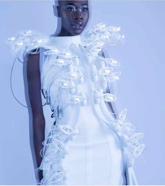 بينما تتلقى أجهزة الاستشعار معلومات، تتحرك أجزاء من الفستان وتضيء، اعتماداً على مستوى نشاط دماغ المرتدي.إذا كان يشعر الشخص مثلاً بالاسترخاء، يضيء الفستان باللون البنفسجي المهدئ. لكن إذا كان المرتدي متوتراً، فستبدأ الأضواء بالخفقان و"الأجنحة" على كتفي الفستان بالرفرفة. يُعرَض الفستان حالياً في مهرجان Ars Electronica في النمسا.