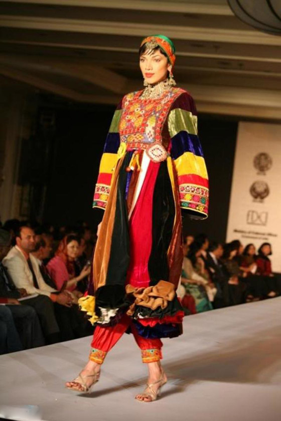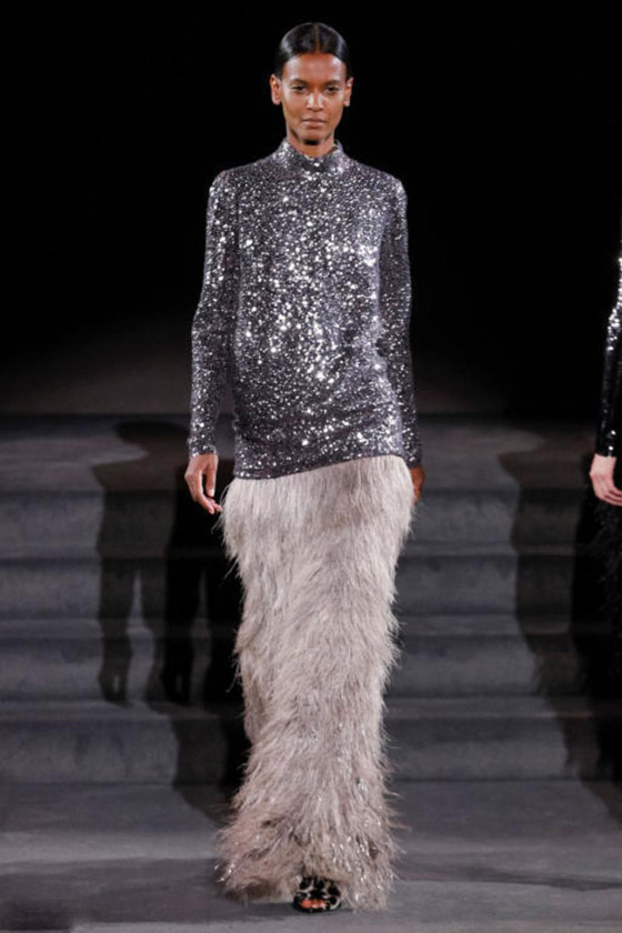 ارتداء بلوزة طويلة لامعة لونها فضي على تنورة بيضاء في إحدى العروض للأزياء في حركة جريئة ظهرت العارضة بالتصميم الجرئ وهي ترتدي فستان طويل وغطاء للرأس بنفس اللون لا يظهر منها غير العيون، يبدو أنه صمم خصيصا للحفلات التنكرية ويصعب ارتداء هذا التصميم في أي مكان أخر.