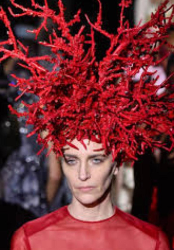 طالت أيادي المصممين أيضاً القبعات في عروض الأزياء وقدموا العديد من الأفكار غير المألوفة ويصعب ارتداؤها في الحياة العامة. حيث اطلت العارضة وعلى رأسها شكل غريب بديل للقبعة أحمر اللون، مع ارتداء فستان بنفس الدرجات للون الأحمر الناري.