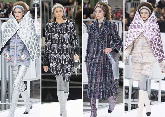 وتضمن العرض إطلالة لعارضة أخرى بمعطف رمادي متداخل مع اللون الوردي وتظهر العارضة بارتداء حذاء متطابق مع لون المعطف ويعد التصميم جَرِيء وغير مألوف. وأطلت العارضة الثالثة بإطلالة غريبة قد لا تعجب الكثير بارتداء معطف عليه رسومات للإنسان الفضائي على عكس جميع التصميمات السابقة والتي تظهر في ألوان معاطف مختلفة ودون أي رسومات.