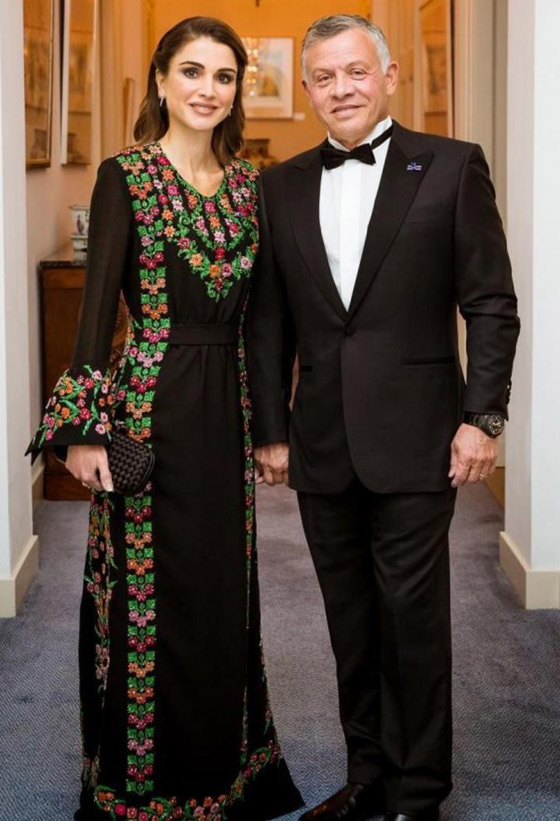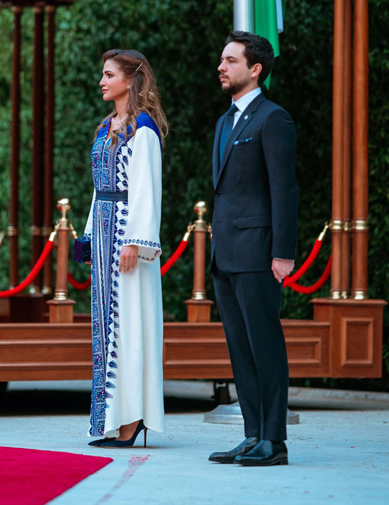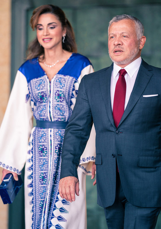 الملكة الأردنية الفخورة بعروبتها وبثقافة بلدها، كثيرًا ما تتألق بالثوب الأردني الذي يحمل تطريزات دقيقة صنعته أيادي أردنية من فترة لأخرى، وتضفي عليه لمساتها الشخصية الخاصة اختيار الأقراط والقلادات المتلائمة مع الإطلالة الأردنية الأصيلة وغالبًا ما تختار اكسسوارات مزينة بالأحجار الكريمة الملوّنة.