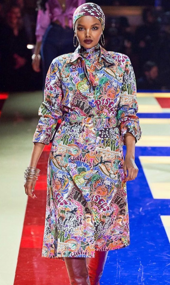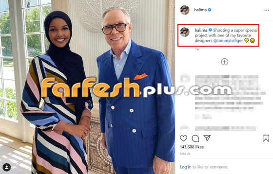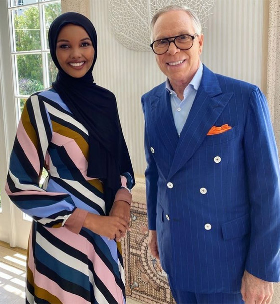 وحصلت الصورة على أكثر من 143 ألف إعجاب، وكتبت حليمة تعليقاً أسفلها يقول: "أصور مشروعاً ضخماً خاصاً مع أحد المصممين المفضلين بالنسبة إلي، تومي هيلفيجر". وكانت ترتدي في الصورة حجاباً أسود مع رداء مخطط أنيق، بينما كانت تقف بجوار المصمم البالغ من العمر 70 عاماً.