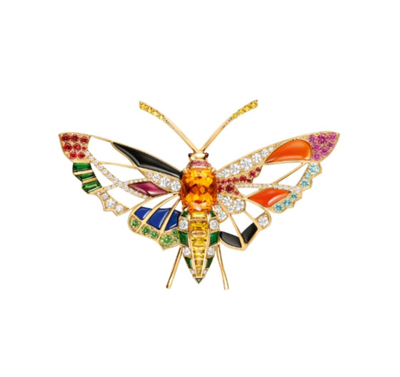 تتميز علامة شوميه «Chaumet» بتقديم المجوهرات الراقية والفريدة من نوعها، فقد اخترنا لكِ هذا التصميم المُنعش لبروش مُصمم من الذهب الأصفر عيار ١٨ قيراطاً، ومُرصّع بعقيق ماندرين بغطاء سادة والياقوت الأصفر والوردي، وحجر الإسبنيل الأحمر والعقيق التسافوريت بالإضافة إلى حجر الزمرد واللازورد، مع الأونيكس الأسود، والعقيق الأحمر , ويُمكنكِ اعتماد هذا البروش الأنيق مع فستان من الشيفون والدانتيل باللون الأزرق مع صندل ذي كعب رفيع باللون الأسود وحقيبة يد صغيرة لامعة