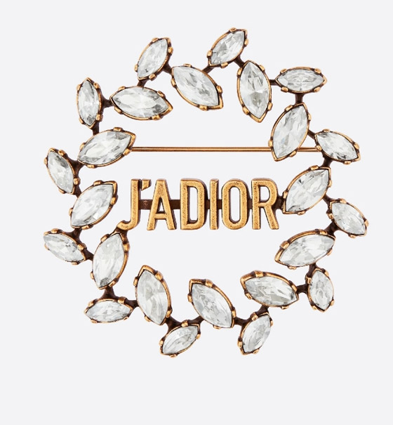لبروش أنيق مناسب للإطلالات الرسمية المسائية، قدمت علامة ديور «Dior» تصميماً لبروش بشكل دائري ومُحاط بإكليل JA'DIOR المُصمم من المعدن المطلي بالذهب العتيق ، والمُرصع من الكريستال المتلألئ وتعكس بلورات ماركيز بيضاء المقطوعة أشكال الأوراق، وهي مجموعة لامعة تشيد بالمرأة القوية والأنثوية وويُمكنكِ اختيار هذا البروش مع بلوزة ذات أكمام منفوشة باللون الأسود و سروال باللون البيج الفاتح مع حذاء بكعب عريض وحقيبة يد باللون الفضي