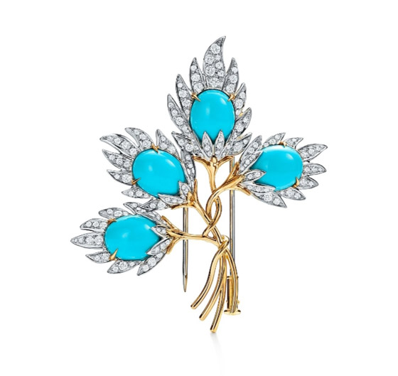 تُعد إبداعات جان شلمبرجير ذات الرؤية المستقبلية من أكثر التصاميم الرائعة في العالم وهي مستوحاة من النباتات، وقد أعجبنا هذا البروش من دار تيفاني أند كو «Tiffany & Co» المُصمم من الذهب الأصفر عيار ١٨ قيراطاً والبلاتين مع حجر الفيروز الأزرق المرصّع بالألماس الدائري اللامع، وجاء البروش بأربعة كابشون فيروزية بيضاوية ,وبإمكانك تنسيق هذا البروش مع جامبسوت باللون الأبيض ذي أرجل واسعة وحذاء بكعب عالٍ باللون الأسود