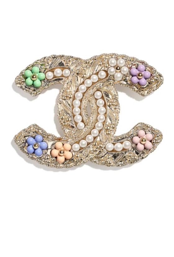 قدمت ماركة شانيل «Chanel» مجموعة تصميمات مختلفة للبروش لموضة صيف 2021 لكي تناسبك إطلالتك لحفل الزفاف والمناسبات الرسمية، وقد اخترنا لكِ تصميماً فاخراً لبروش مُصمم من الذهب الأصفر المُرصّع بعرق اللؤلؤ الأبيض واللؤلؤ المتعدد الألوان مع المعادن المتلألئة الزجاجية، وجاء البروش على علامة ماركة شانيل وويُمكنكِ اختيار هذا البروش مع فستان ضيق بقصّة أنثوية باللون الزهري لإطلالة مسائية فاخرة مع صندل ذي أربطة طويلة حول الساق بألوان متعددة من نفس ألوان البروش.