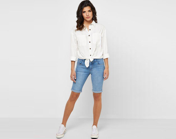 وأوضحت المجلة المعنية بالموضة والجمال أن الشورت الجينز يطل هذا الموسم بمظهر أنيق يعكس النضج والرصانة ليضفي على المظهر لمسة فخامة ورقي؛ حيث يأتي الشورت بطول يصل إلى الركبة وقصة ليست واسعة للغاية، كما أنه يكتسي بألوان هادئة كالأسود والأبيض والأزرق الداكن.