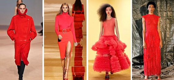 لون مثير يمنح الثقة لمرتديه. وقامت فيفين ويستوود بتعزيز مجموعتها الخريفية بأكسسوارات قرمزية، من الجوارب التي تصل إلى الركبة إلى القبعات. وقامت إميليا ويكستيد بتبني اللون الأحمر من أعلى إلى أخمص القدمين، حيث جمعت بين قميص قصير وتنورة على شكل حرف A في شارع هاي ستريت.
