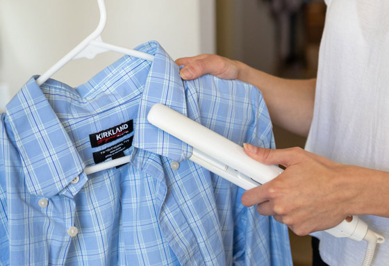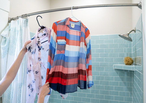 5- البخار أثناء الاستحمام: إن كنت اضطررت إلى غسل الملابس يدوياً عندما تكون بعيداً عن المنزل، فيجب تعلُّم كيفية التخلص من تجاعيد القميص أثناء السفر. علِّق العنصر المتجعد في الحمام وقم بتشغيل الدش باستخدام المياه الأكثر سخونة. أغلِق الباب لخلق تأثير الساونا. تحقق مرة أخرى بعد نحو 10 دقائق، تستغرق هذه الطريقة وقتاً طويلاً وكمية مياه ساخنة لا بأس بها للحصول على كمية البخار المطلوبة، وانتبه من أن يتبلل القميص!