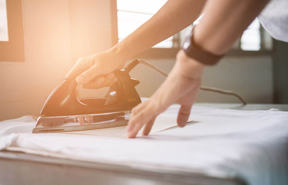 3- أداة تمليس الشعر: تعمل المكواة المسطحة لأداة تمليس الشعر بشكل جيد على التجاعيد المستعصية، خاصةً في المناطق التي يصعب كيّها مثل الياقات والأصفاد والأكمام. تأكَّد من أن الجهاز ليس صدئاً أو ملطخاً بمنتجات الشعر أو به شعيرات سائبة. وكن حذراً من إعداد الحرارة والضغط الذي تستخدمه؛ كي لا تتلف الملابس أو تحرق يديك.