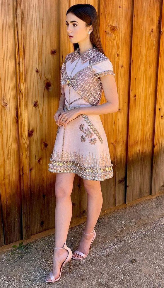 - اختارت الممثلة الأميركيّة ليلي كولنز ثوباً قصيراً باللون الزهري الفاتح من توقيع دار Georges Hobeika تميّز بنعومة تصميمه وتطريزه. وهي نسّقته مع مجوهرات ماسيّة من دار Cartier. وهي ظهرت بهذه الإطلالة في حفل SAG Awards الذي أقيم افتراضياً في شهر أبريل الماضي.