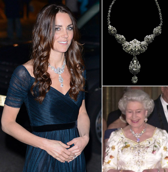 وسبق أن ظهرت كيت ميدلتون زوجة الأمير ويليام بقلادة الملكة إليزابيث في إحدى المناسبات المهمة عام 2014. وتتضمن القلادة 13 ماسة رئيسية، على شكل زمرد وكمثري مرتبطة بسلسلة من 38 حجرًا ماسيًا أصغر من الماسات الأساسية. وبالنسبة لقيمة القطعة، كشف الخبير أنه من المرجح أن تبلغ قيمة هذه القلادة الفريدة في الوقت الحالي، ما بين 65 إلى 70 مليون جنيه إسترليني أي ما يعادل 95 مليون دولار أمريكي.