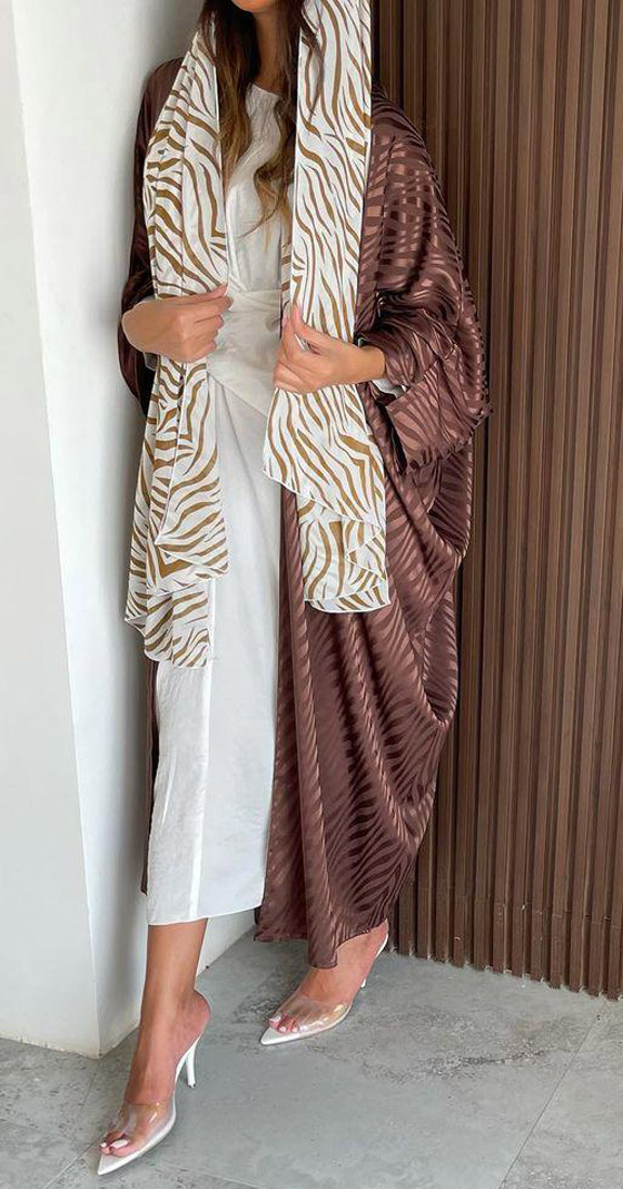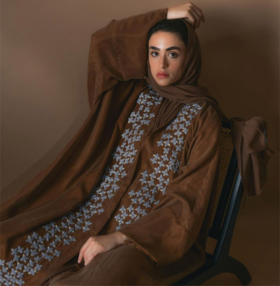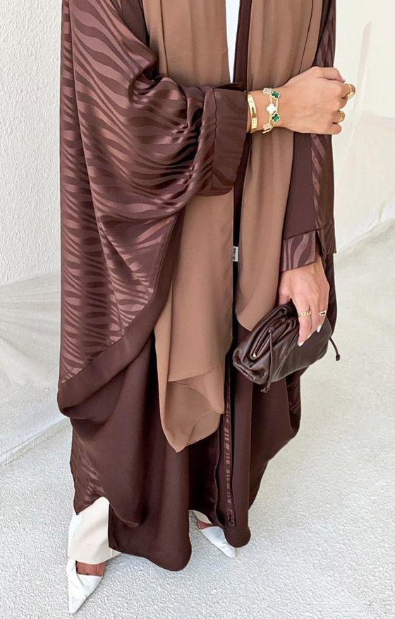 أحببنا العبايات الواسعة المصممة باللون البني الداكن والمزينه بخطوط لامعه من توقيع ماركة Des Farah وKM Collection، جربي تنسيقها مع فستان أبيض من نفس طولها وحذاء Pointy شفاف أو باللون الأبيض وأعتمري طرحة بيضاء أو باللون البني. قدمت ماركة AiSHAZ عبايه بنية اللون مزينه من الأمام بتطريز أزرق فاتح جربي تنسيقها مع طرحة وكنزه من نفس لونها وبنطال جينز أزرق فاتح وانتعلي بوت باللون الأسود.