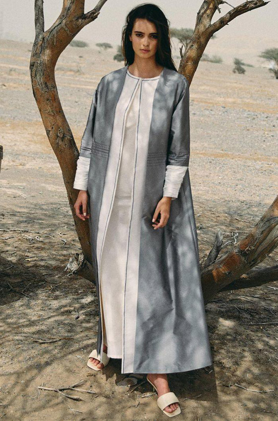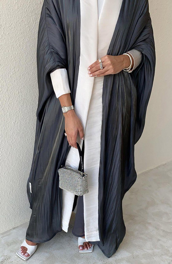 ظهرت عارضة ماركة Des Farah بعباية مكسره رمادية داكنة بياقات بيضاء، لائميها مع قميص أبيض وبنطال أبيض واسع وتممي اللوك بحذاء وحقيبة من اللون عينه. أعجبتنا العبايه التي تمزج بين اللون الرمادي الفاتح والداكن، نسقيها مع فستان أسود طويل وأكملي الطلة بحذاء شفاف بكعب عالي وحقيبة Tote باللون الأسود.