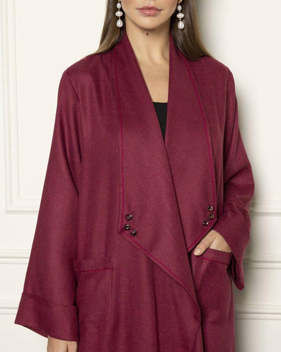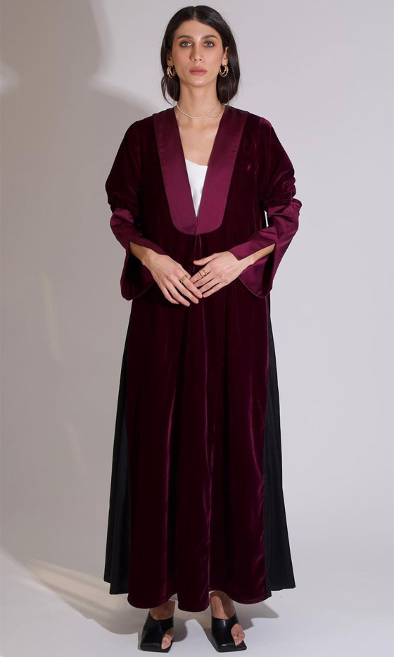 أدرجت ماركة عفة الدباغ Effa عبايه برغنديه مميزة بياقاتها العريضة، نسقيها مع توب أسود وبنطال جينز Skinny أزرق داكن وانتعلي بوت أسود، أما العباية المخمل البرغنديه من مجموعة وعد ديزاينز Waad Designs ارتديها مع توب أبيض وبنطال أسود وانتعلي حذاء أسود Mule.