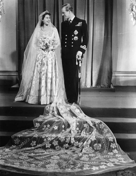 1- البداية مع زفافها عام 1947 لاسيما وأن الثوب الذي ارتدته كان غنيا بالمعاني. الثوب حمل توقيع نورمان هارتنيل Norman Hartnell تميز بذيل طوله 15 قدم وزينته أشكال نجوم استوحاها من لوحة بوتيشتيلي Primavera وكان رمزاً لفترة من النمو والولادة بعد الحرب العالمية الثانية. صنع الثوب من الحرير العاجي الذي قامت الأميرة بجمع كوبونات لدفع ثمنه لأن البلاد كانت تعيش أزمة مالية بعد الحرب العالمية الثانية، لكن ذلك لم يمنع أن يتم ترصيعه بـ 10 آلاف حبة من اللؤلؤ والكثير من الكريستال.