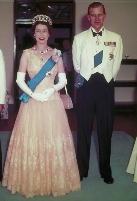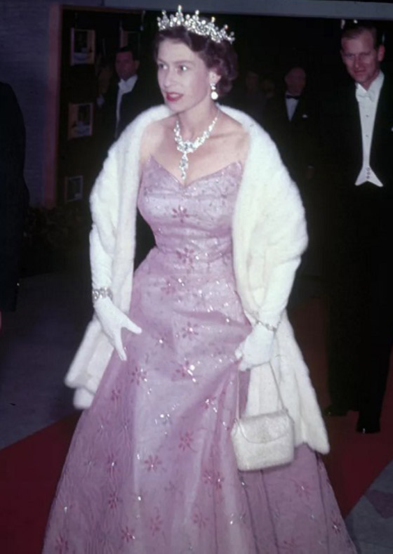 3- عام 1951 عندما زارت أوتاوا في كندا اختارت إليزابيث التي كانت لا تزال أميرة بريطانيا في ذلك الوقت فستاناً باللون الزهري مزين بأنماط من الدانتيل على شكل ورود. وأكملت إطلالتها بتاج نظام حيدر أباد Nizam of Hyderabad وعقد غريفيل Greville المرصع بالياقوت والألماس.