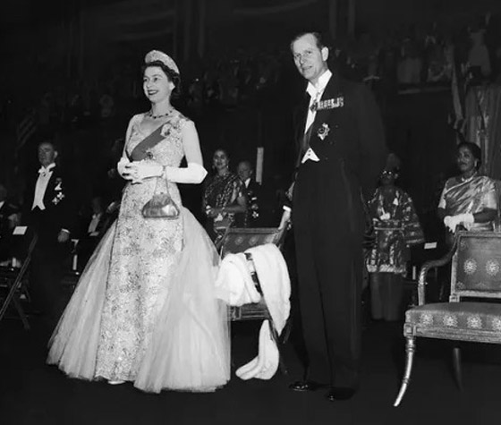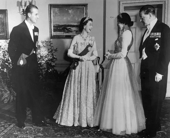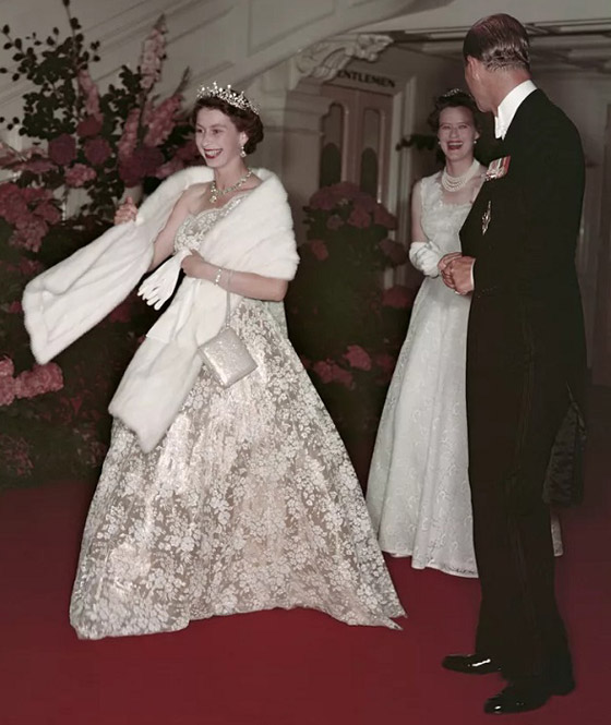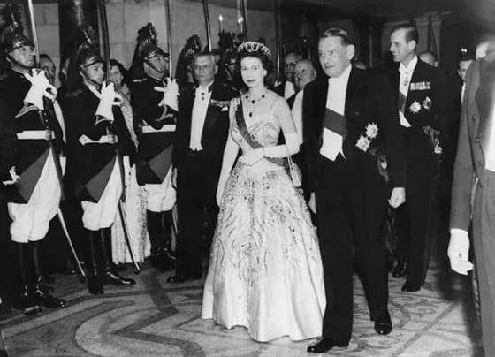 5- عام 1954 حيث حضرت الملكة المتوجة حديثا مأدبة عشاء في أستراليا أقيمت على شرفها واختارت فستانا فخماً مزينا بالزهور مع وشاح من الفرو.