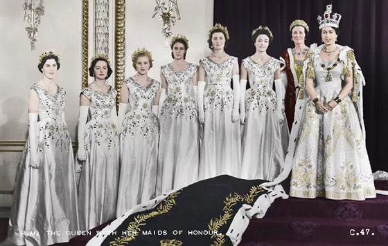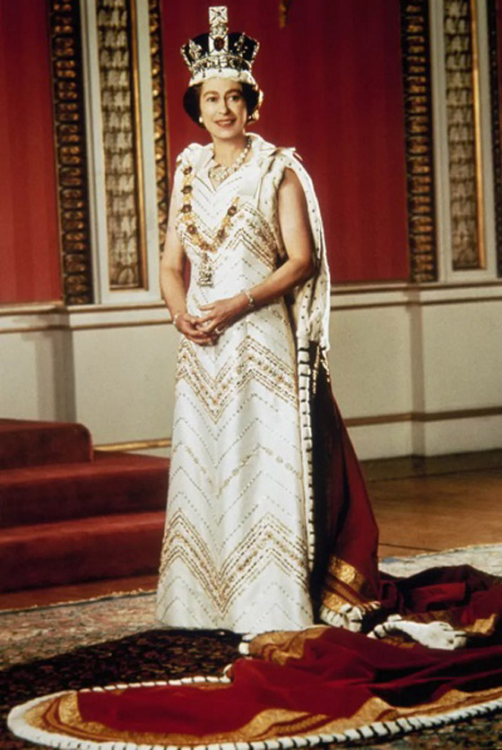 4- عام 1953 لمناسبة تتويجها ملكة على بريطانيا كلفت المصمم نورمان هارتنيل Norman Hartnell بتصميم فستان التتويج. وقد اضطر المصمم أن يصمم 9 فساتين اختارت إليزابيث الثامن منها. احتاج تصميم الفستان المصنوع من الحرير إلى الكثير من الوقت وأكثر من 6 عاملات تطريز على الأقل بسبب احتوائه على الكثير من التفاصيل. فقد زين الفستان برموز زهور من بريطانيا ودول الكومونولث مثل الوردة الإنجليزية والنفل الأيرلندي وورق القيقب الكندي والشوك الاسكتلندي والكراث الوايلزي وغيرها. وقد ارتدته الملكة أكثر من مرة عام 1954 لخطاب في البرلمان ومرة ثانية لخطاب في كندا 1957.