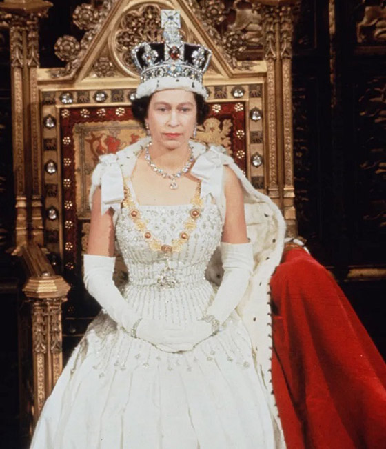 11- عام 1966 من أجل أن تلقي خطابا أمام البرلمان اختارت إليزابيث فستانا من تصميم نورمان هارتنل ارتدته مرتين قبل ذلك مرة لتكريم الرئيس الإيطالي عام 1961 ومرة لحضور افتتاح فيلم لورانس العرب عام 1962، وقد ارتدته مع تاج Imperial State. تميز الفستان بغناه بالتطريز والخرز الذي يمتد من الصدر إلى منتصف التنورة. هذا الفستان هو نفسه الذي اختارته بياتريس لترتديه يوم زفافها بعد تعديله.
