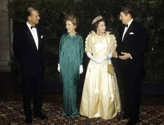 15- عام 1983 مع نانسي ريغان ارتدت فستانا من هاردي أميز Hardy Amies مزين صدره بتطريز زهور شقائق النعمان البرتقالية التي تعتبر الزهرة الرسمية لولاية كاليفورنيا وتنورة باللون الأبيض.