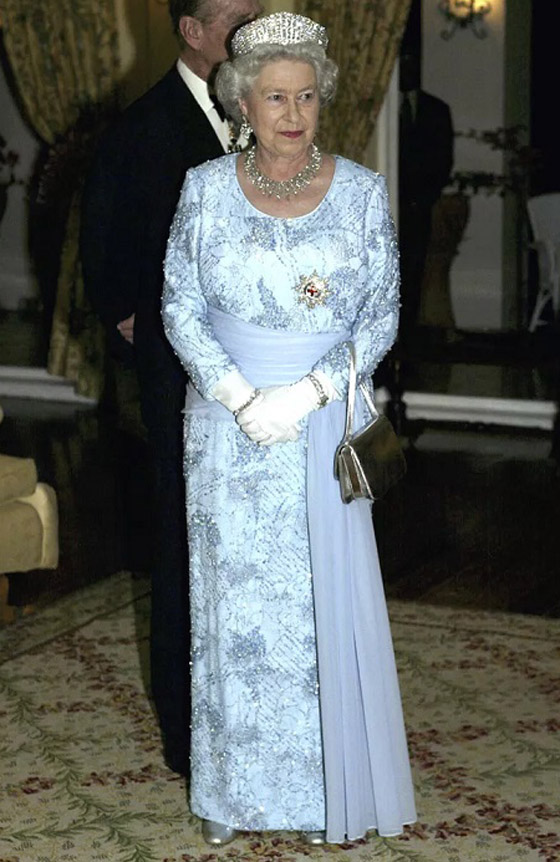 17- عام 2002 بدت الملكة قمة في الأناقة مع فستان بلون الجليد الأزرق من ستيوارت بارفين Stewart Parvin مرصع بالخرز لحضور حفل عشاء في جامايكا.
