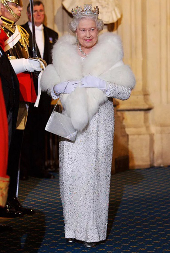18- عام 2006 لفتت الملكة الأنظار إليها بهذا الثوب الأبيض المرصع الذي ارتدت معه وشاح من الفرو من أجل افتتاح البرلمان.