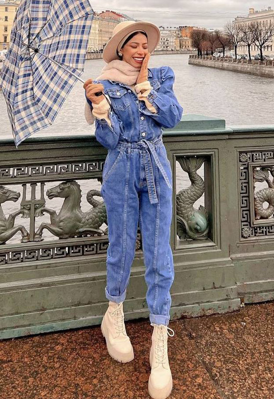 لا تتخلى مدونة الموضة المصرية، منة السني، عن اعتماد أجمل الإطلالات المنسقة بقطع الجينز المختلفة لإضفاء روح شبابية أنيقة ومميزة تناسب كل فتاة نحيلة، وقد اخترنا لك إطلالتها بجمبسوت من الجينز الأزرق مصمم بأكمام طويلة منفوخة الأكتاف مع حزام محدد للخصر، واعتمدت لأناقتها البوت البيج مع قبعة من القش ووشاح بيج.