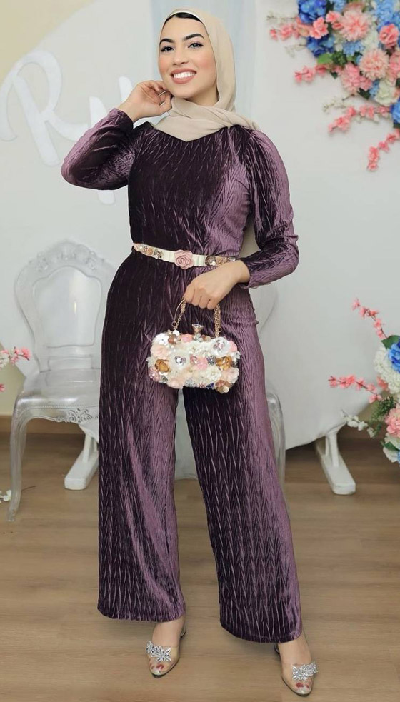 لكل فتاة تعتمد أزياءها بمواكبة أحدث صيحات الموضة، ننصحك باختيار موديلات الجمبسوت الأنيقة في مناسباتك الضخمة وحفلاتك المتنوعة، ويمكنك اعتماد هذه الإطلالة من مدونة الموضة المصرية، مريم عبد الله، حيث تألقت بجمبسوت من المخمل البنفسجي المصمم بحزام محدد للخصر باللون السكري المزين بالزهور مع حجاب بيج وحقيبة بيضاء تكسوها الزهور الملونة، وانتعلت حذاءً شفافاً بكريستال لامع.