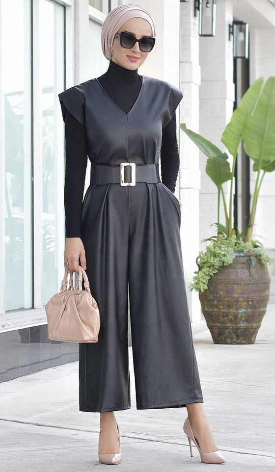 صيحة المونوكروم من الصيحات الأكثر رواجاً خلال الفترات الأخيرة، حيث تُبرز أناقتك ببساطة وتميز، وقد أطلت مدونة الموضة، شاهة هتان، بجمبسوت من الجلد الأسود مصمم بأكمام قصيرة وحزام محدد للخصر مزين باللون الفضي مع تصميم أرجل واسعة، وأكملت حشمتها ببلوزة من القطن الأسود، فيما اختارت لأناقتها اكسسوارات اللون البيج لكسر رتابة الإطلالة.