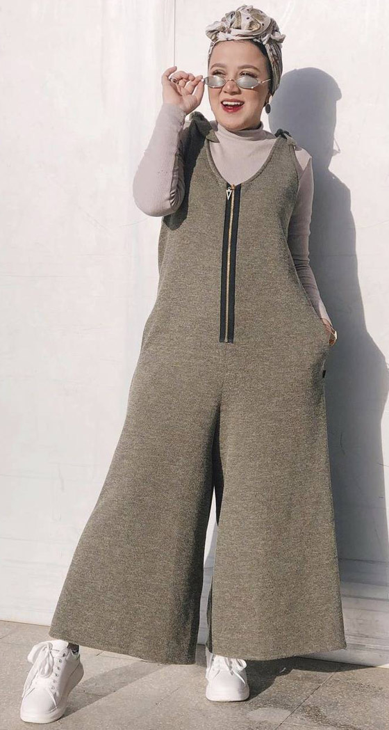لخيار مريح وأنيق مناسب لأناقة الشابات، ظهرت مدونة الموضة المصرية، بطوطة نصر، بجمبسوت زيتي واسع مصمم بخطوط عصرية بيضاء وسحاب أسود في منتصف التصميم مع بلوزة بيج بقصة محتشمة، وأكملت أناقتها بحجاب توربان أبيض مطبع باللون البني، وانتعلت حذاءً رياضياً أبيض لخيار بسيط وأكثر تميزاً مناسب لمشاويرك اليومية.
